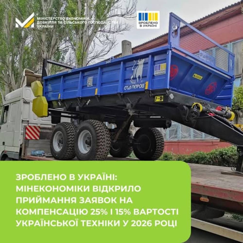 Мінекономіки розпочало приймання заявок на компенсацію 25% вартості української агротехніки та 15% вартості української промислової техніки у 2026 році.